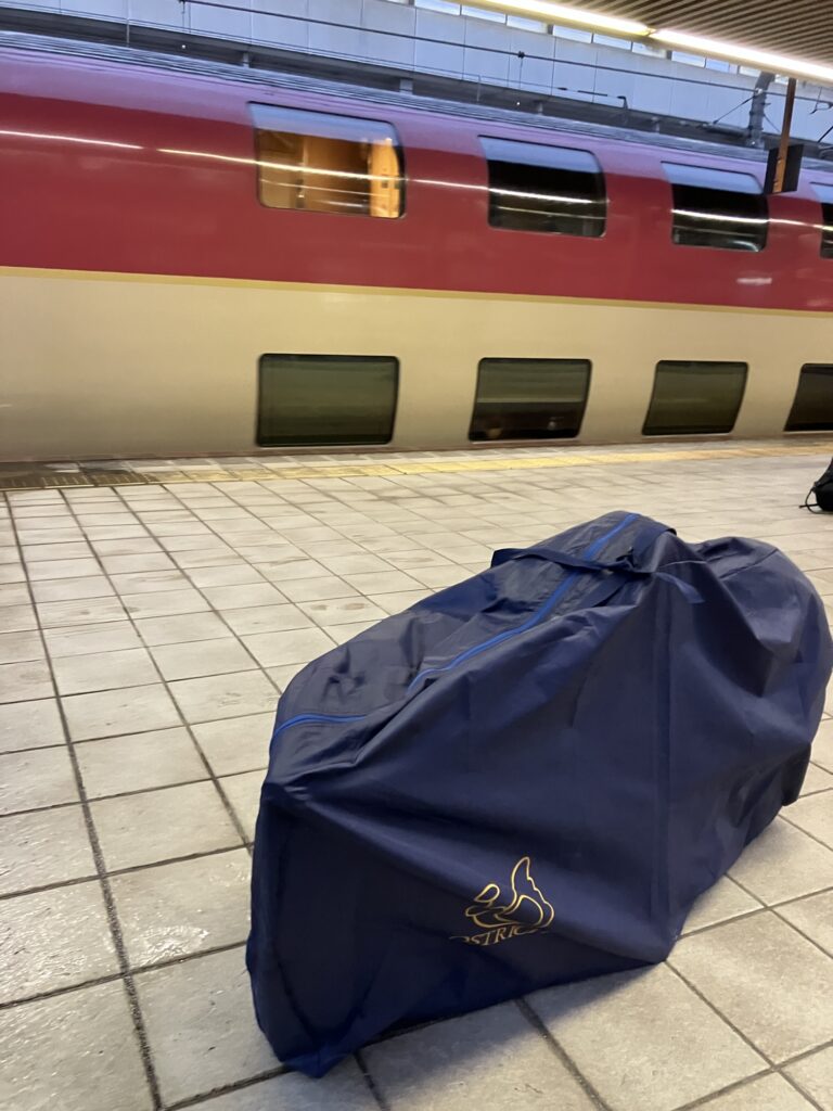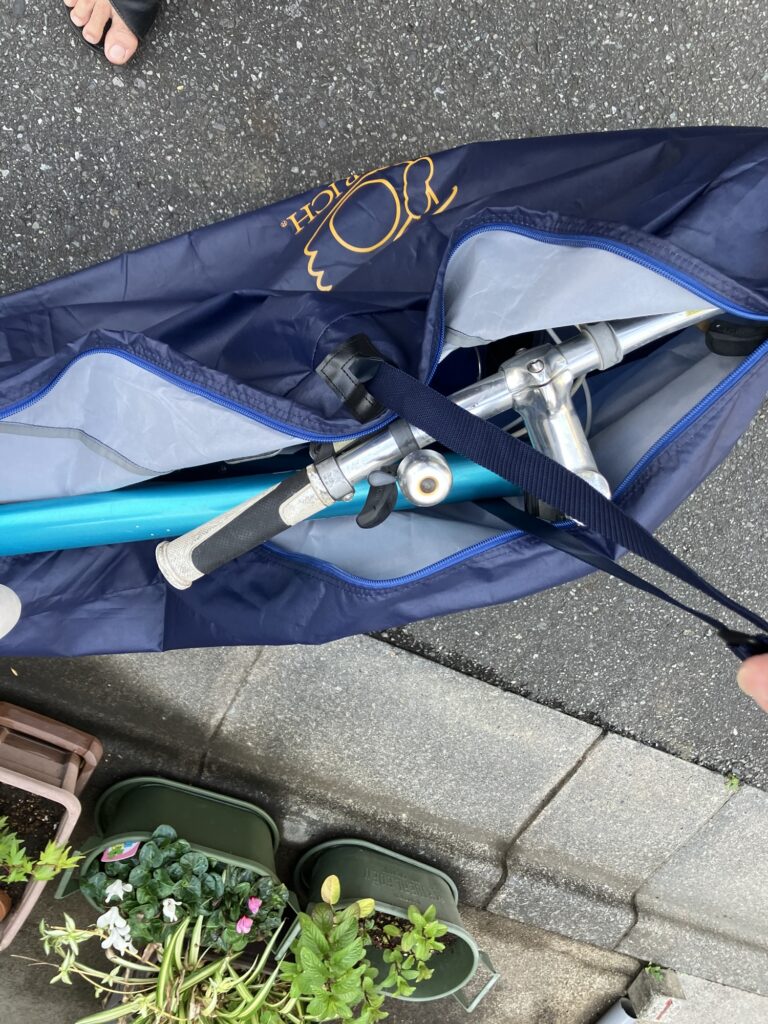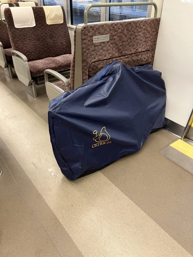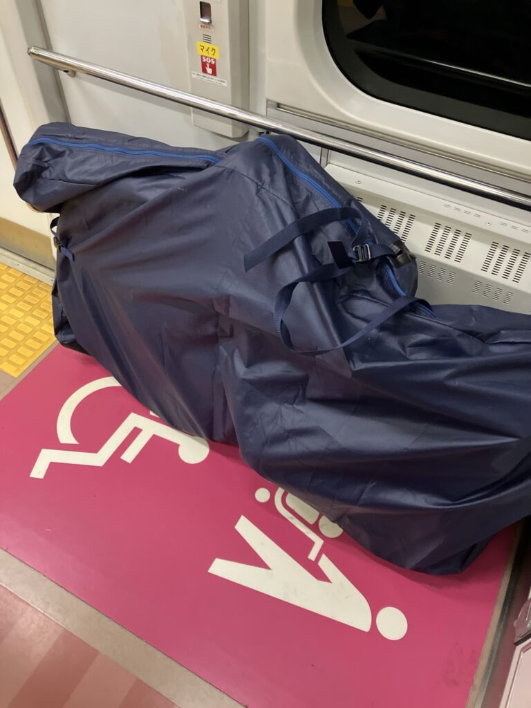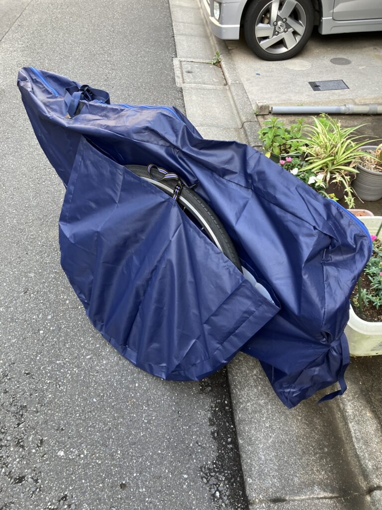 後輪外しはハードル高いので、今回は前輪だけ外せば輪行出来るオーストリッチ(OSTRICH) 社の「超速FIVE」という輪行袋を事前に購入した(ヨドバシカメラで7980円だった)。