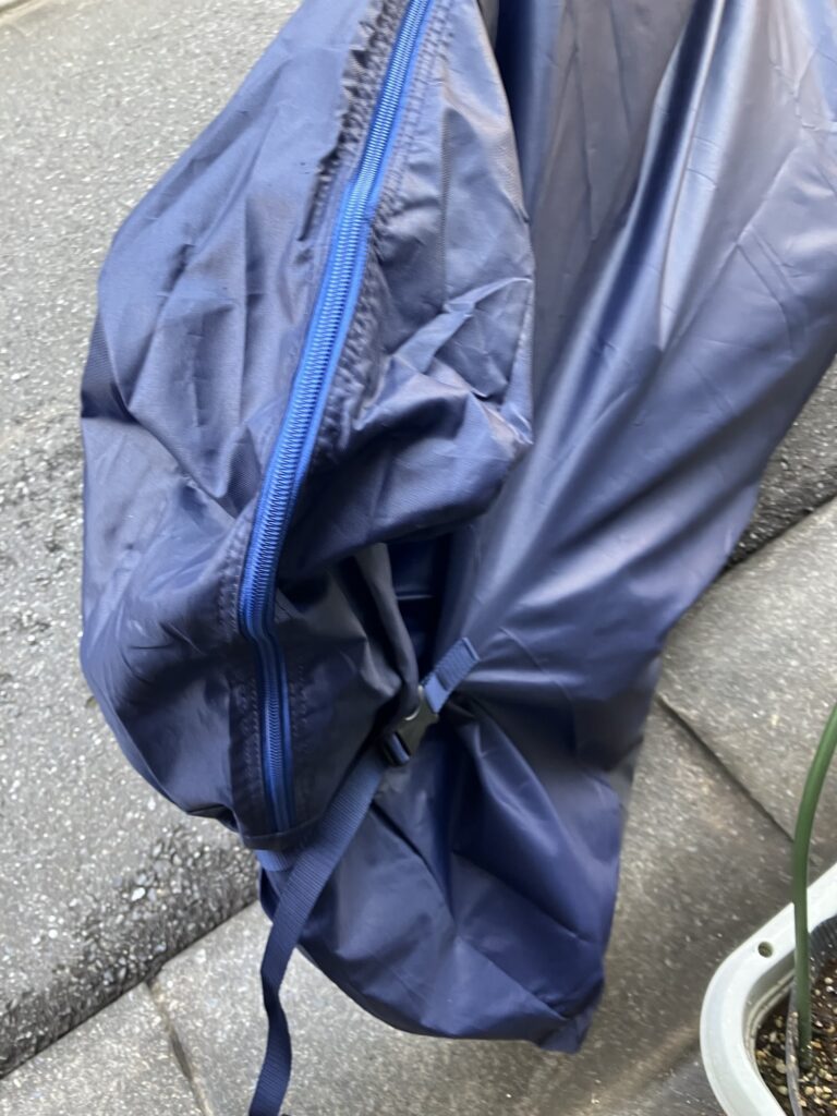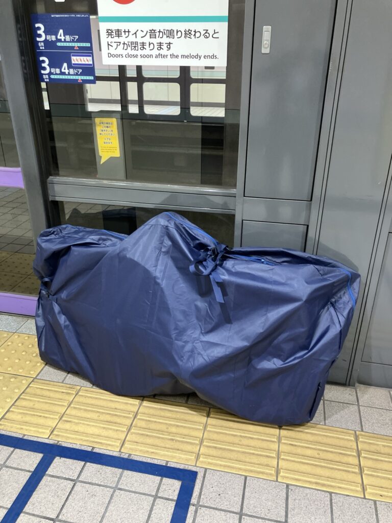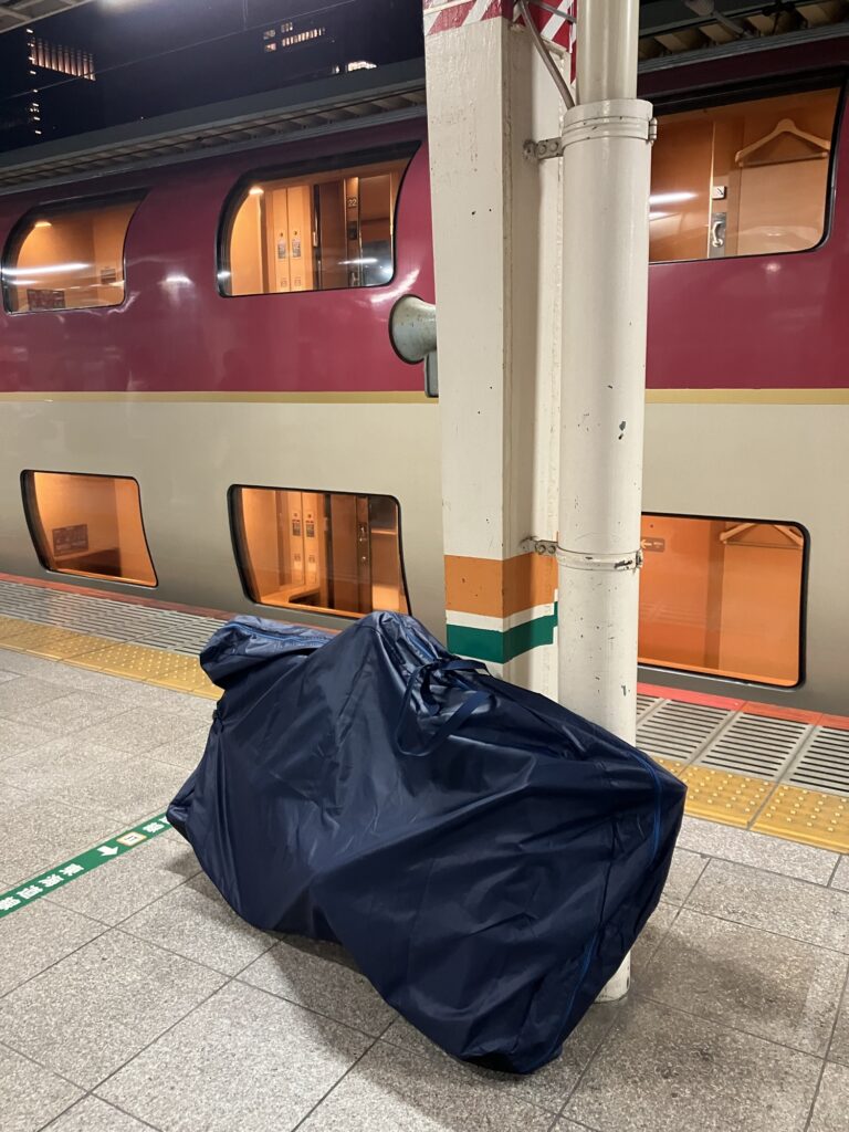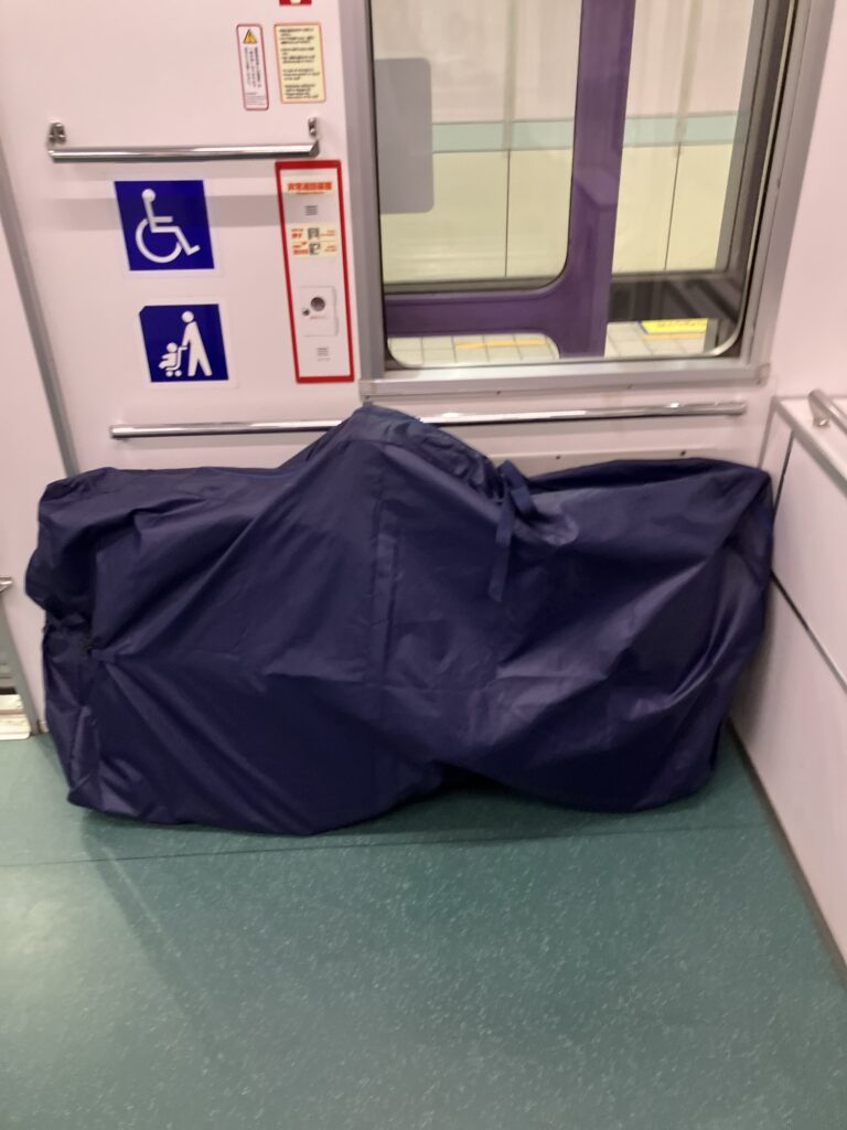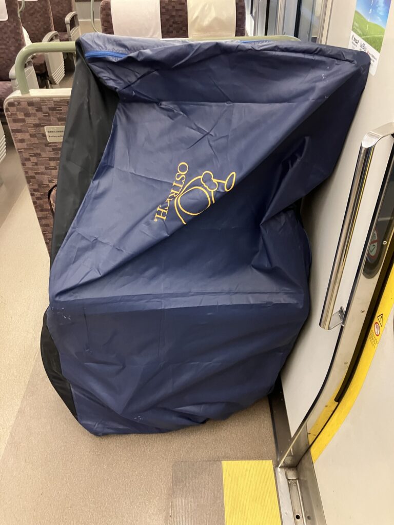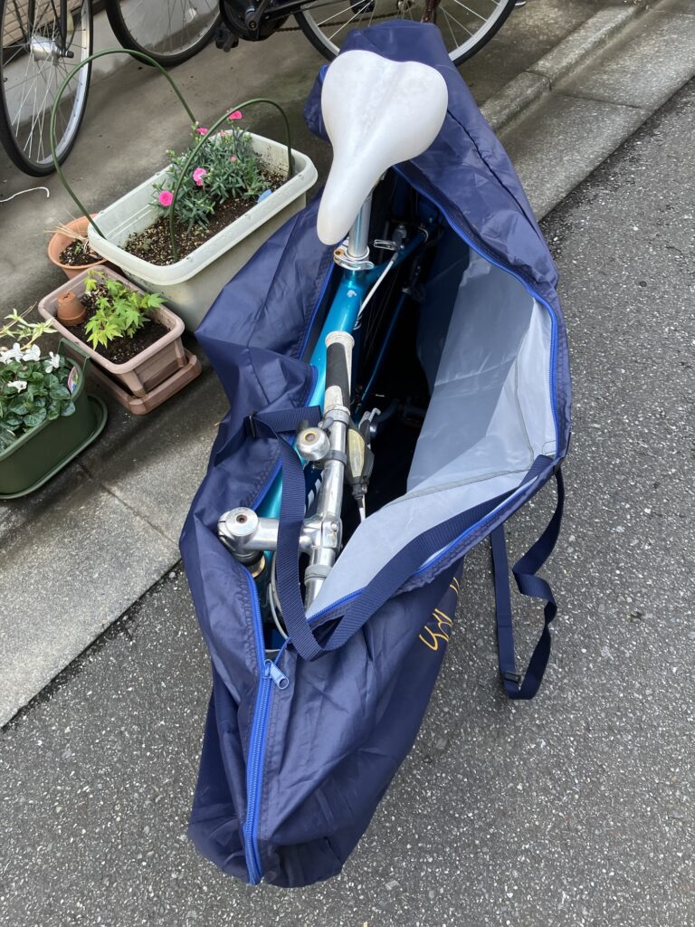 後輪外しはハードル高いので、今回は前輪だけ外せば輪行出来るオーストリッチ(OSTRICH) 社の「超速FIVE」という輪行袋を事前に購入した(ヨドバシカメラで7980円だった)。
