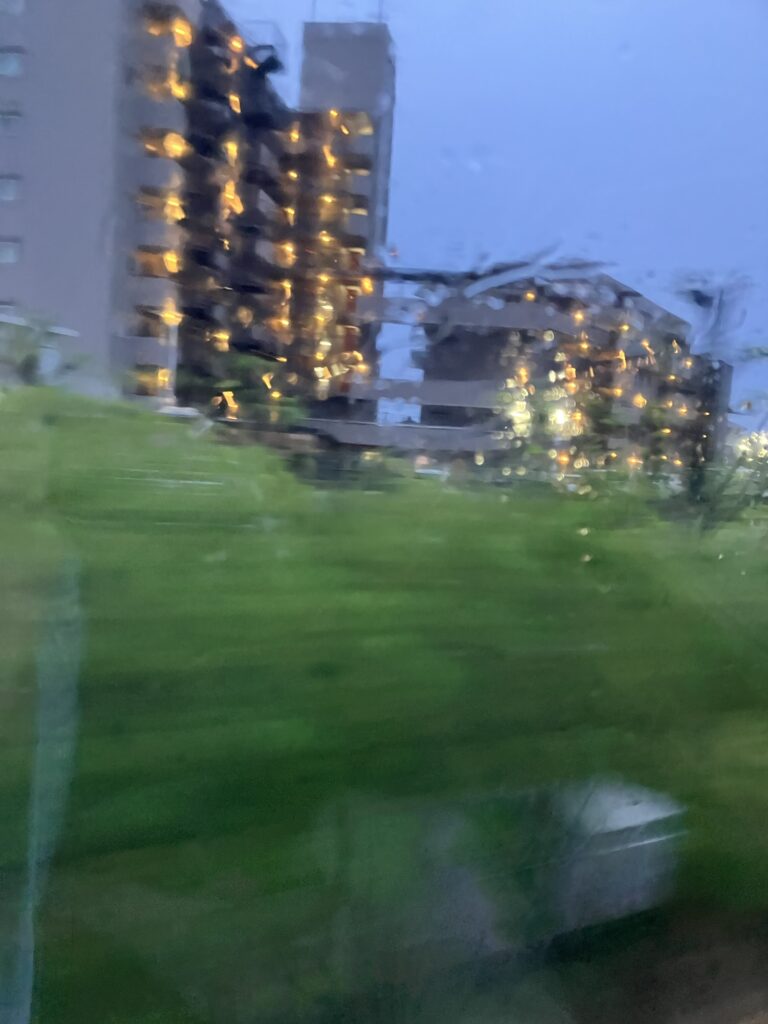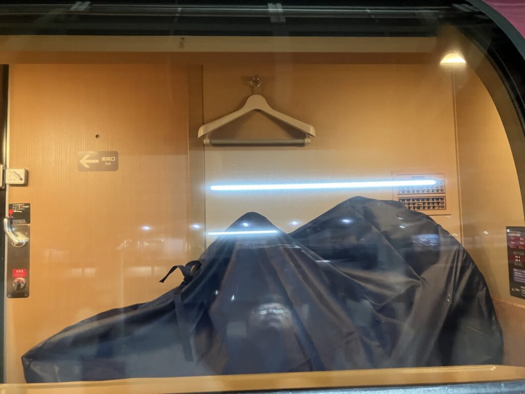 サンライズ出雲瀬戸と輪行袋。窓枠一つが個室一室だが、入るのかなぁ。