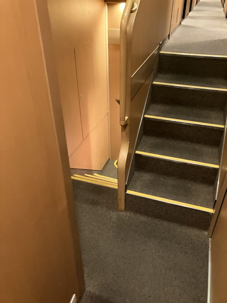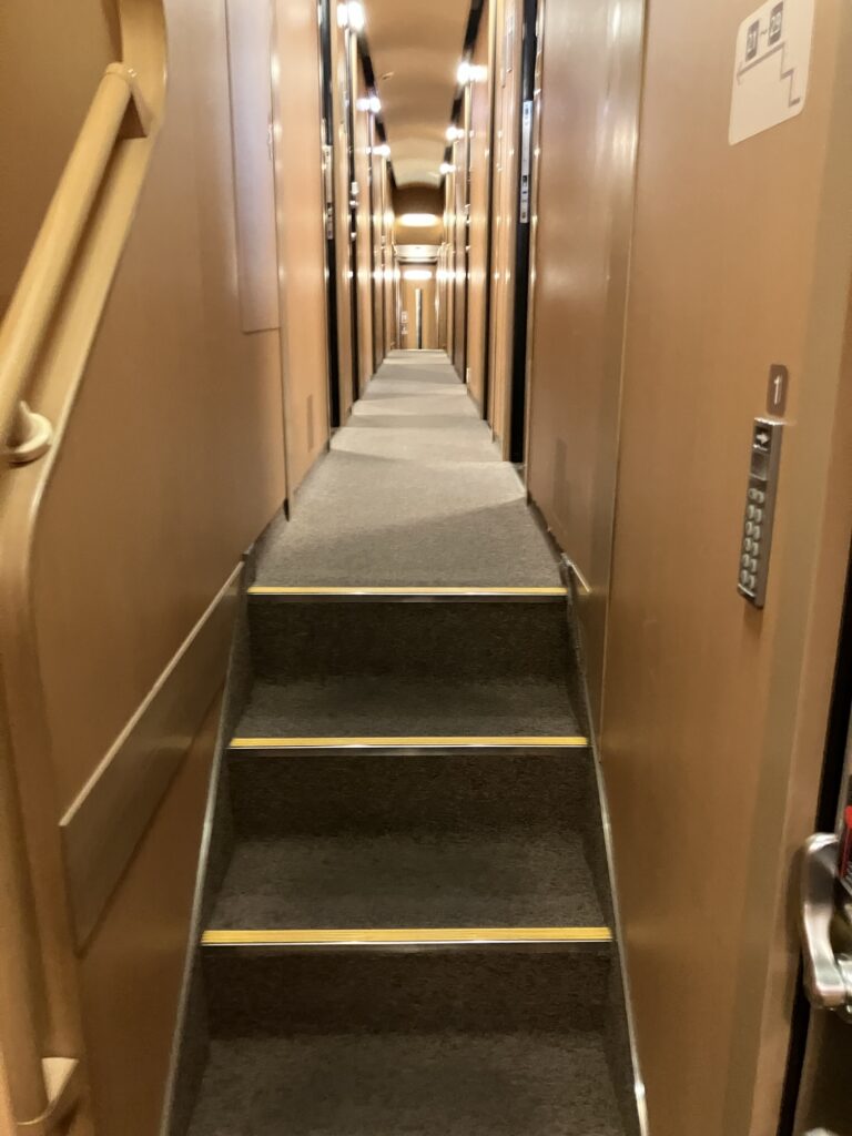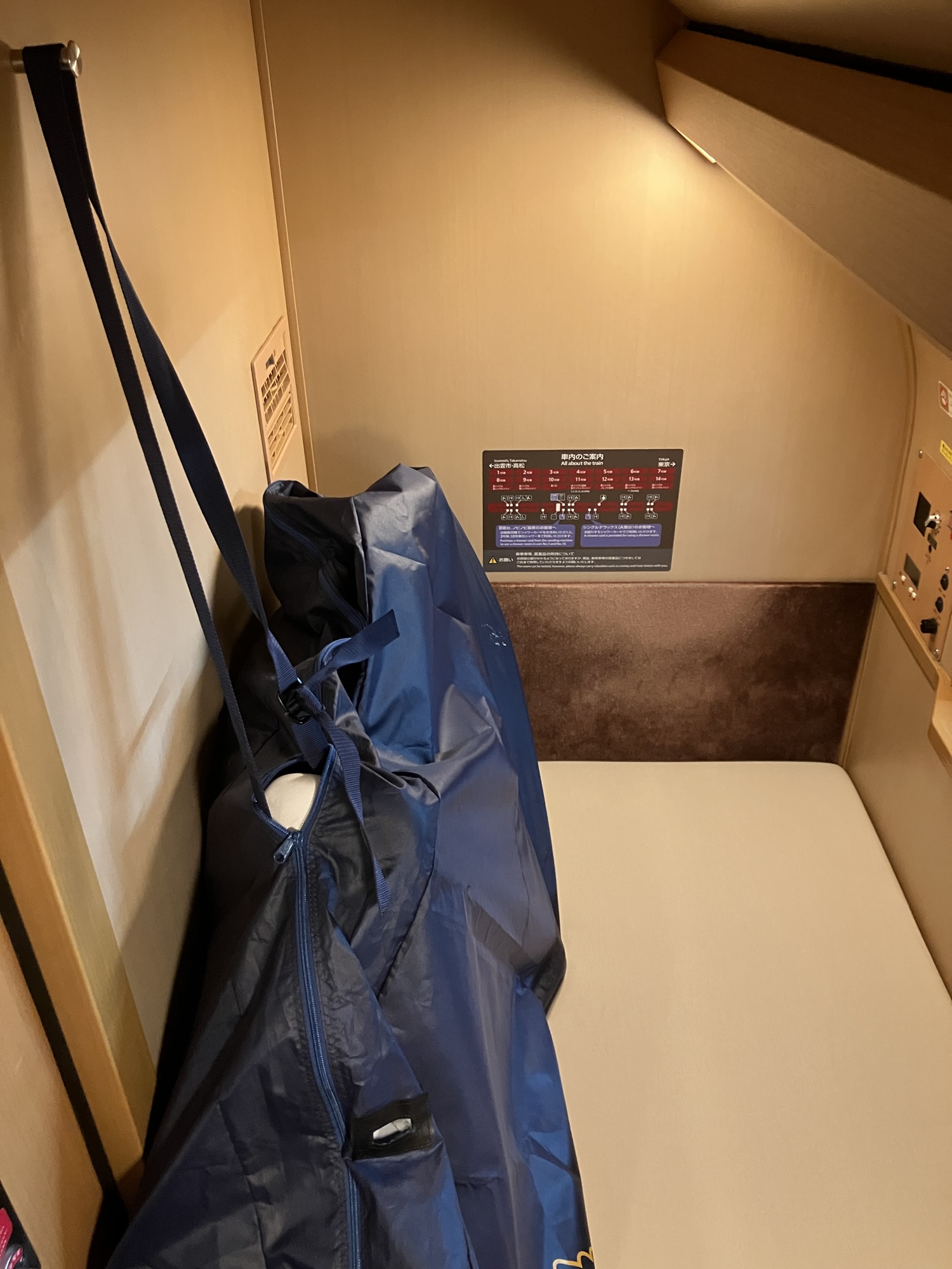 B寝台個室シングル。横幅は荷物置きスペースを若干はみ出しベットスペースを侵食する。