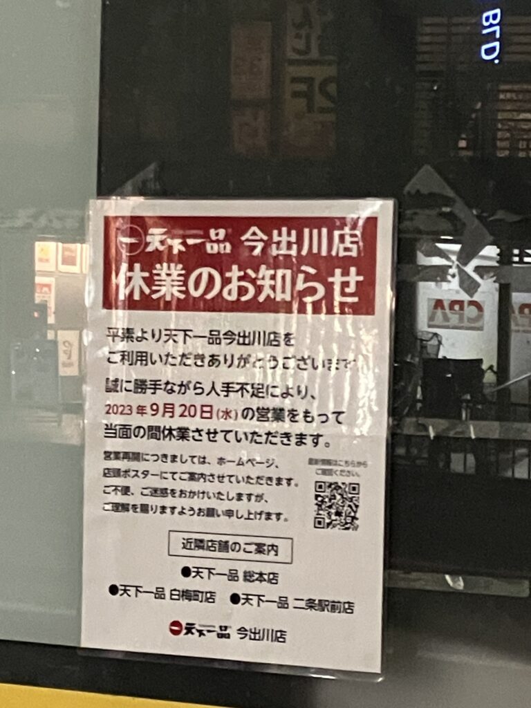 天下一品今出川店も大学時代によく利用したが、残念ながら休業(実質閉店)中。