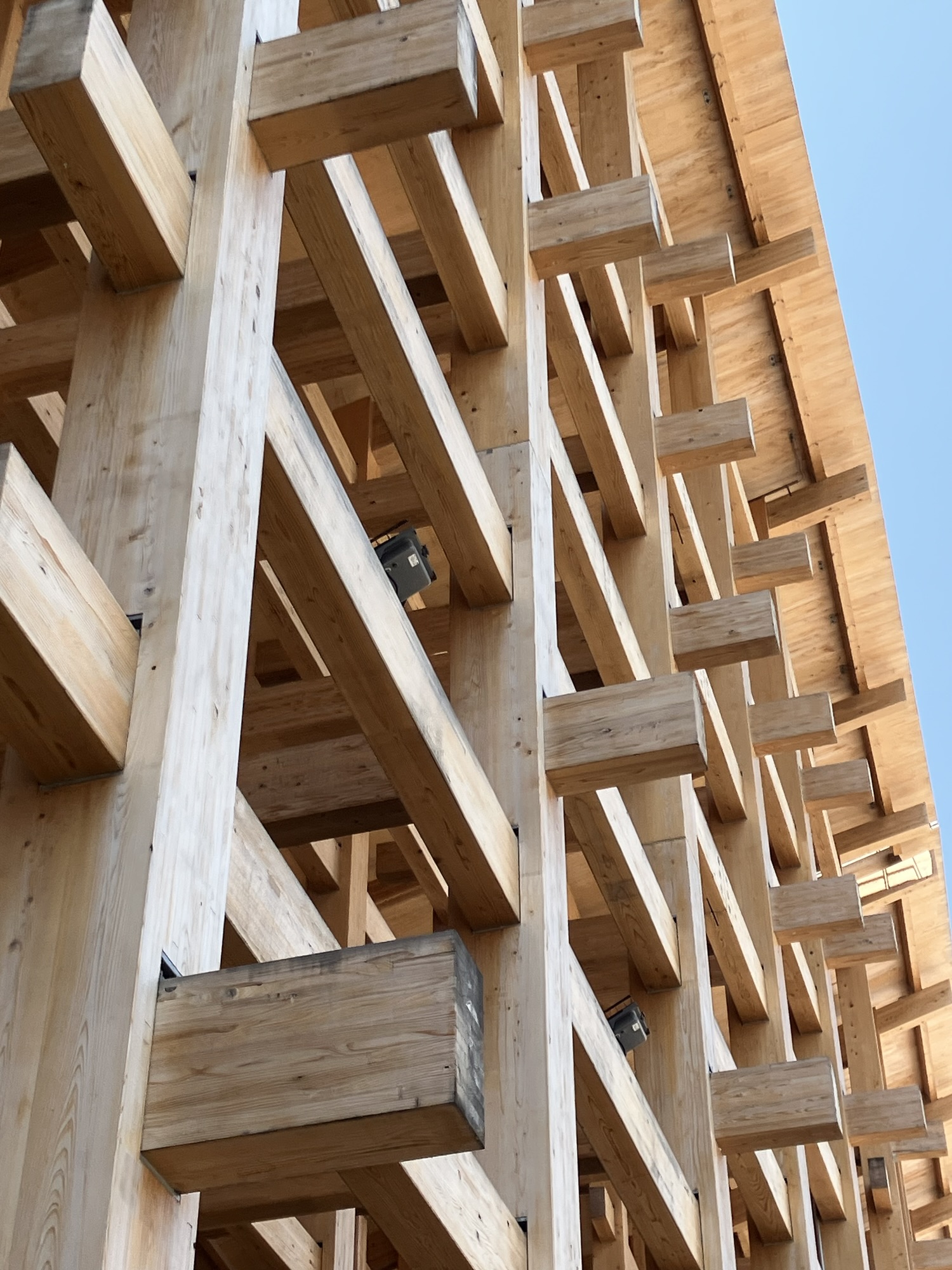 間近に見るとかなりの高さ。エレベーターやエスカレーターがある。