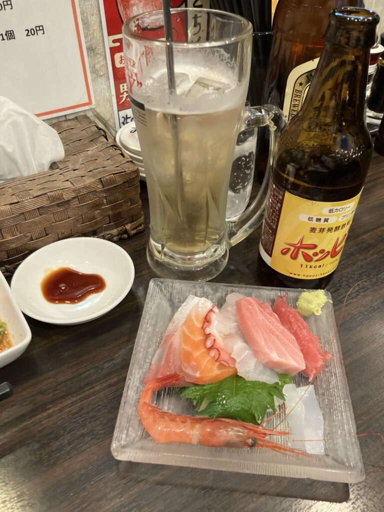 刺身盛りが種類たくさん一切れずつなのが、いろいろ食べられて嬉しい。ホッピーがあるのも良い。