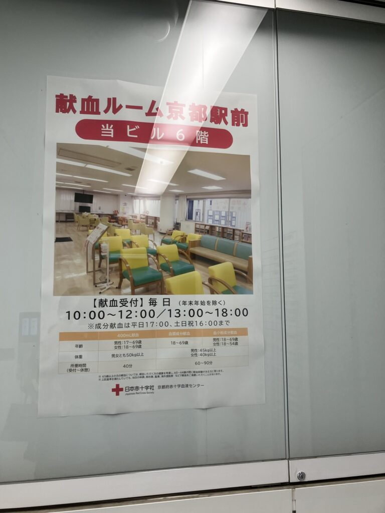 久しぶりの献血。京都駅の献血ルームは初めて。