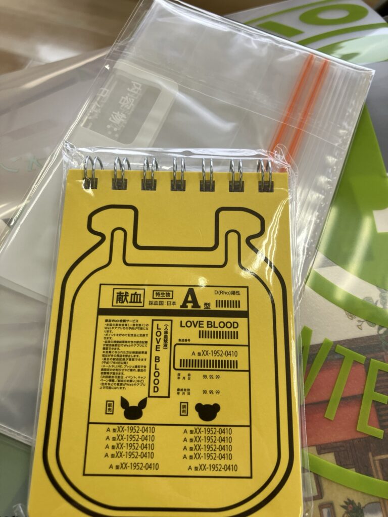 たまっていた献血ポイントで、血液袋がデザインされたメモ帳を貰った。