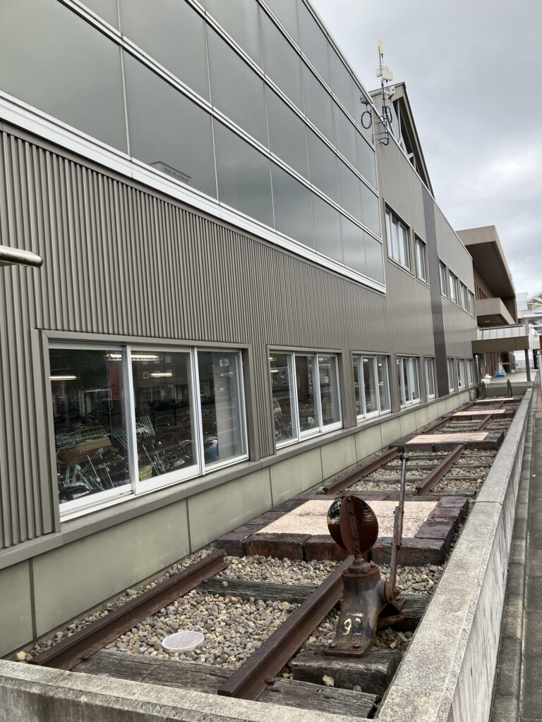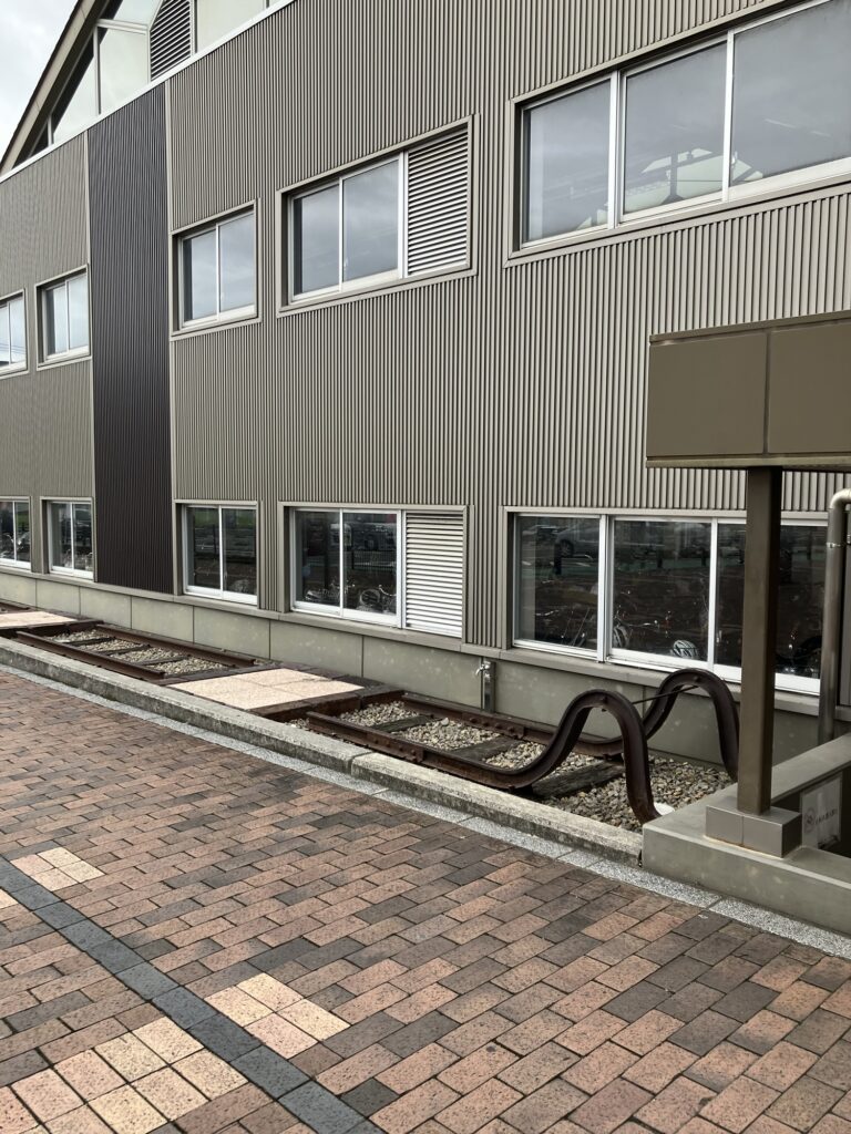 自転車置き場の前に何故か線路のオブジェ。説明板はない。