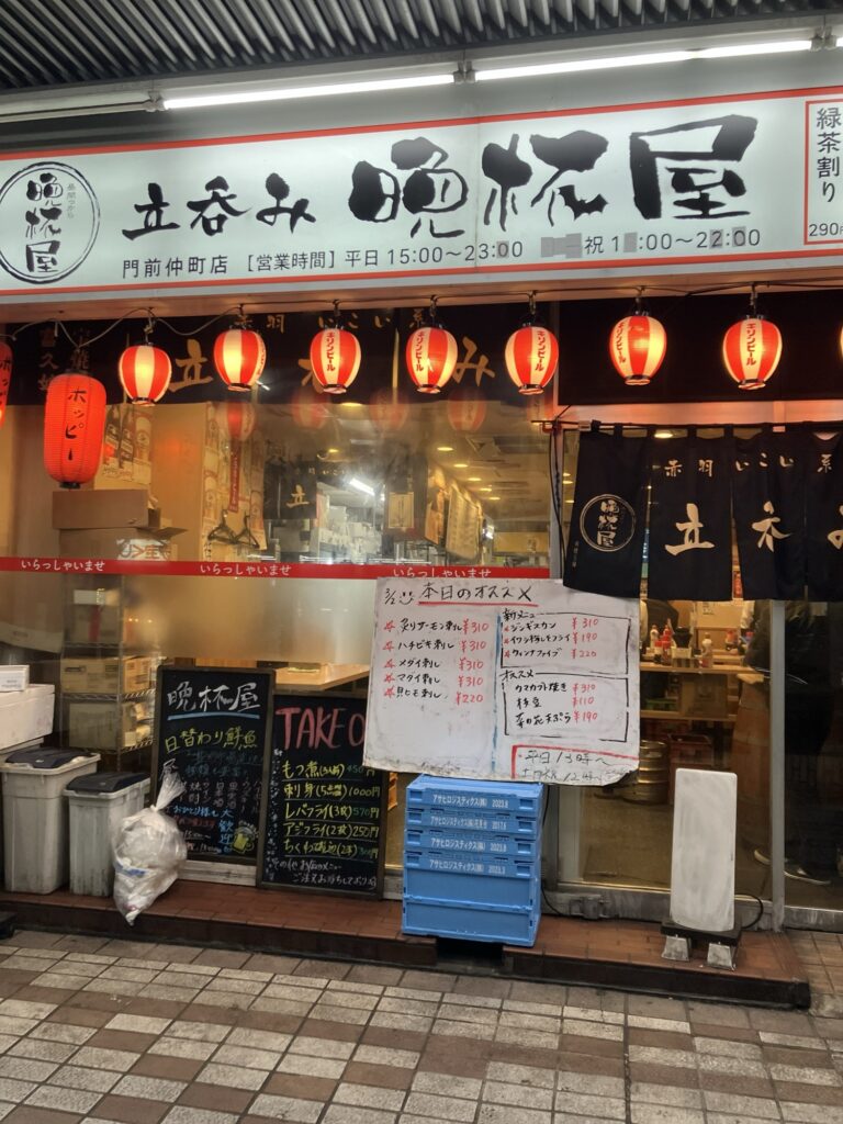 勤務地隣駅の門前仲町駅は飲食店いっぱい。お気に入りの立ち飲み屋の「晩杯屋」もあった。