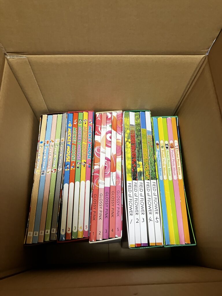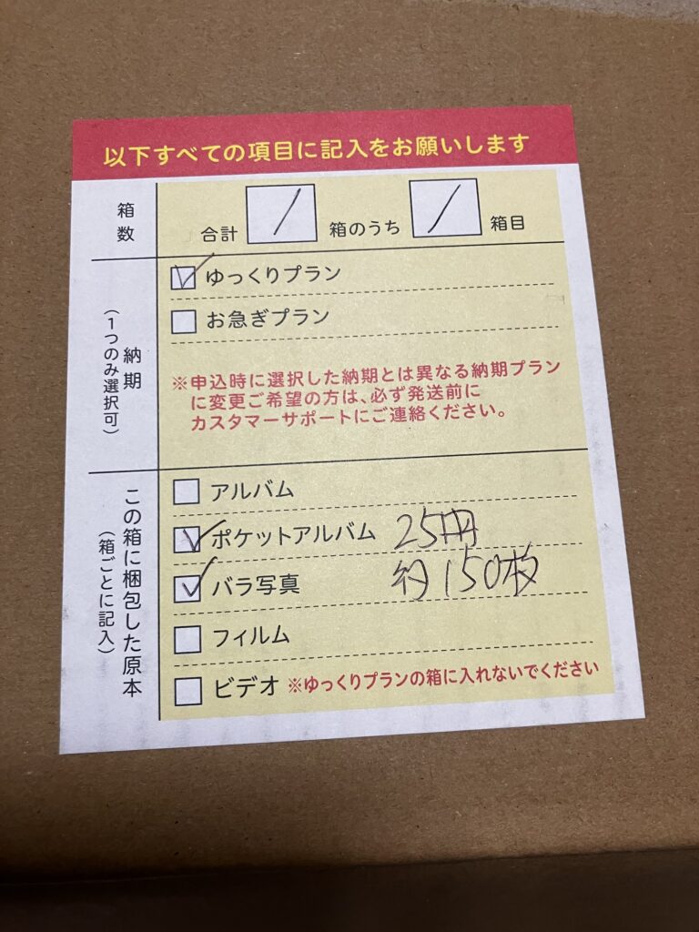 専門業者に依頼。この量で3万円ぐらい費用がかかるが、アルバム置き場がないので思い切って決断