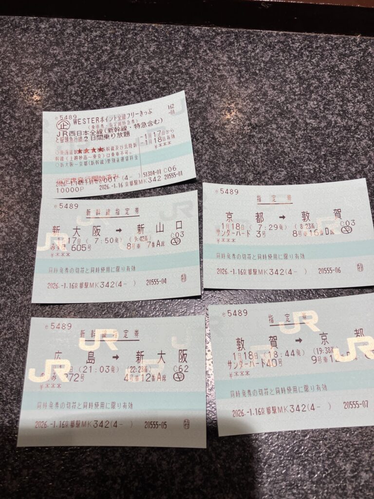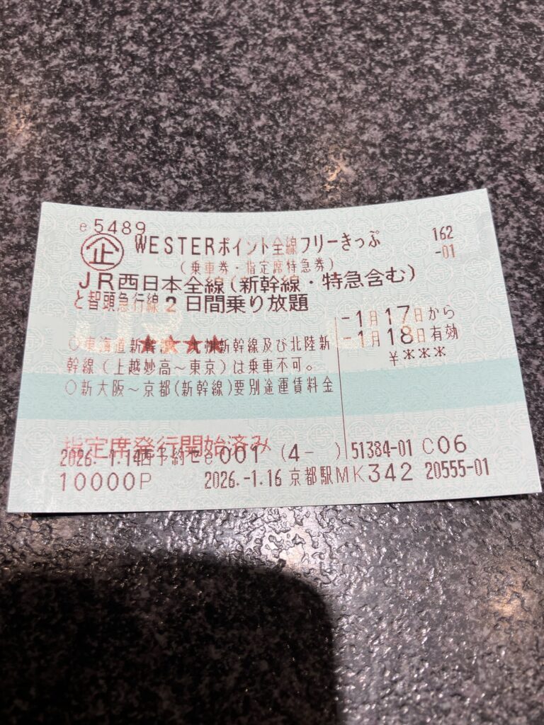 10000ポイントで交換出来るJR西日本全線乗り放題のフリーきっぷに交換。