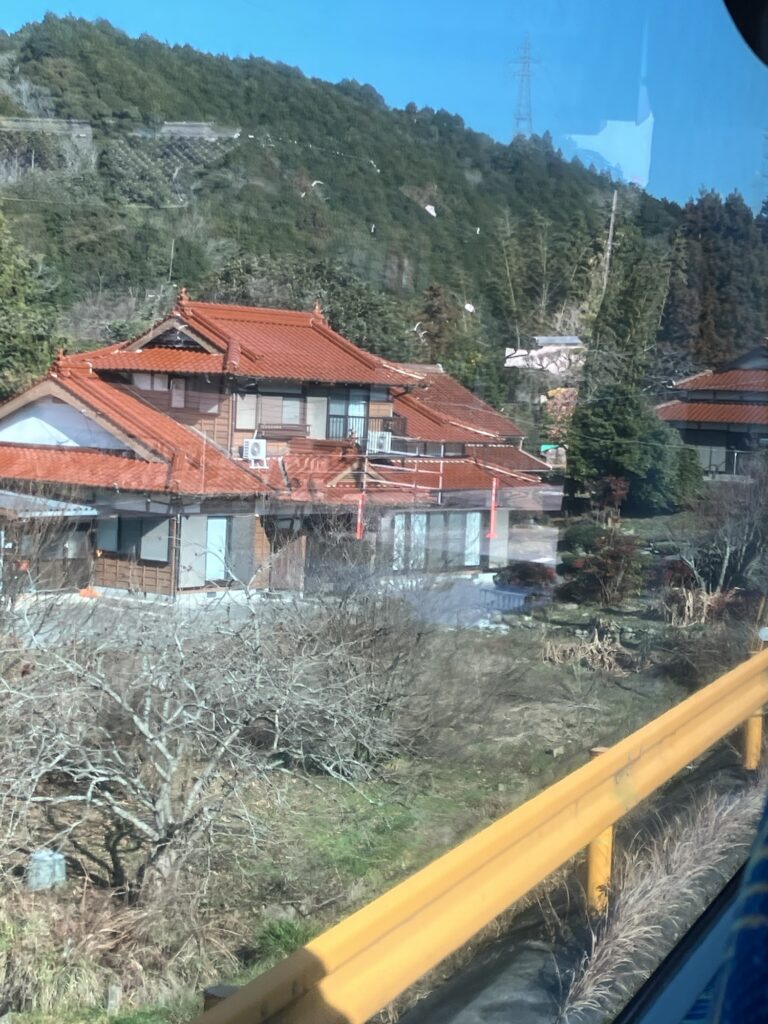 石州瓦という赤褐色の特徴的な瓦の家が車窓に続く