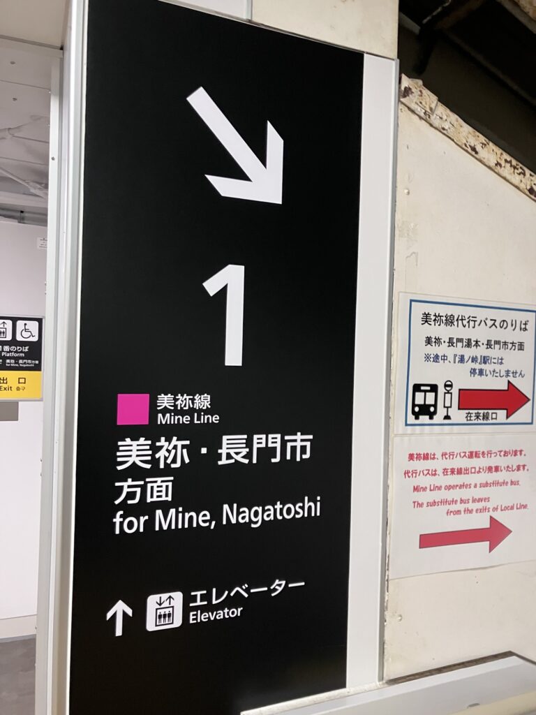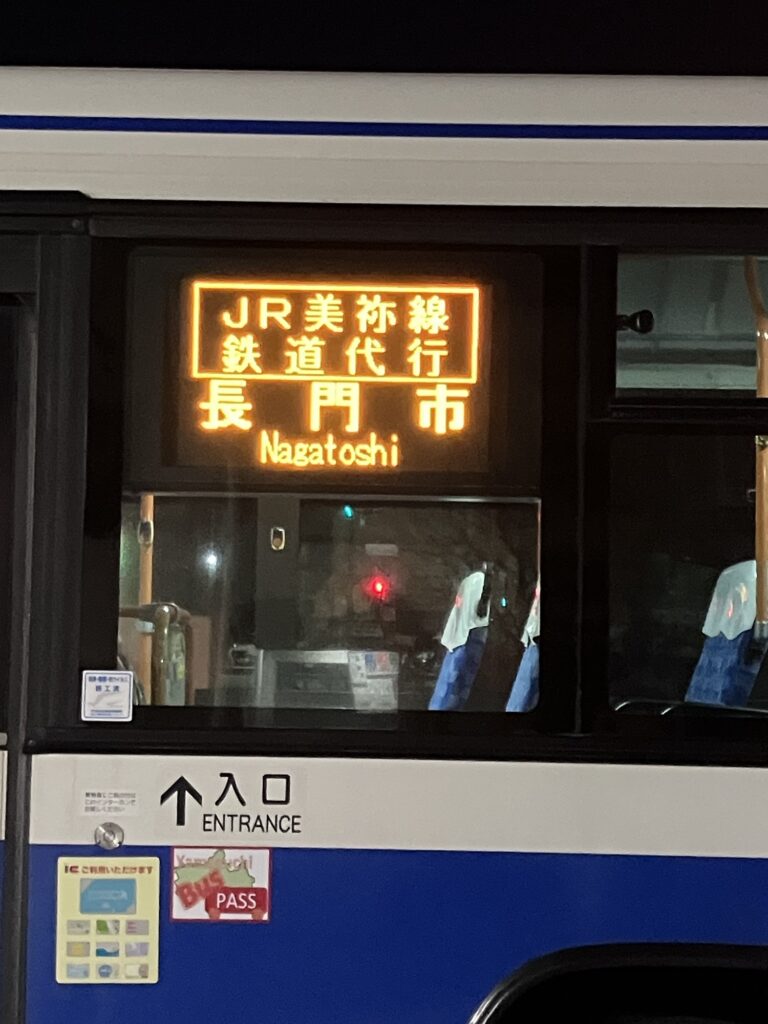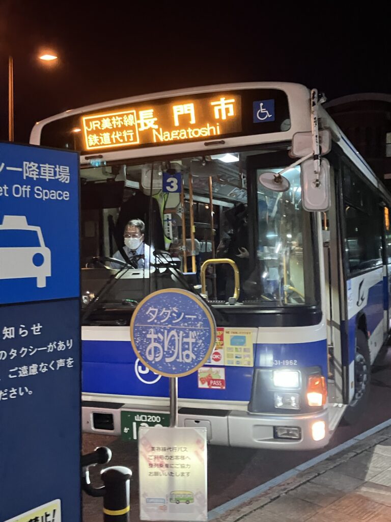 仙崎駅から長門市駅に戻り、災害で不通のJR美祢線の列車代行バスに。行きのスーパー萩号はフリーきっぷ使えなかったが、帰りのこちらは鉄道のかわりの代行バスのため、フリーきっぷで乗れる